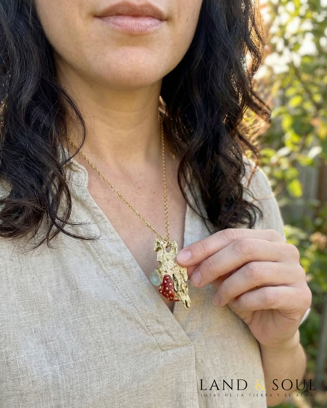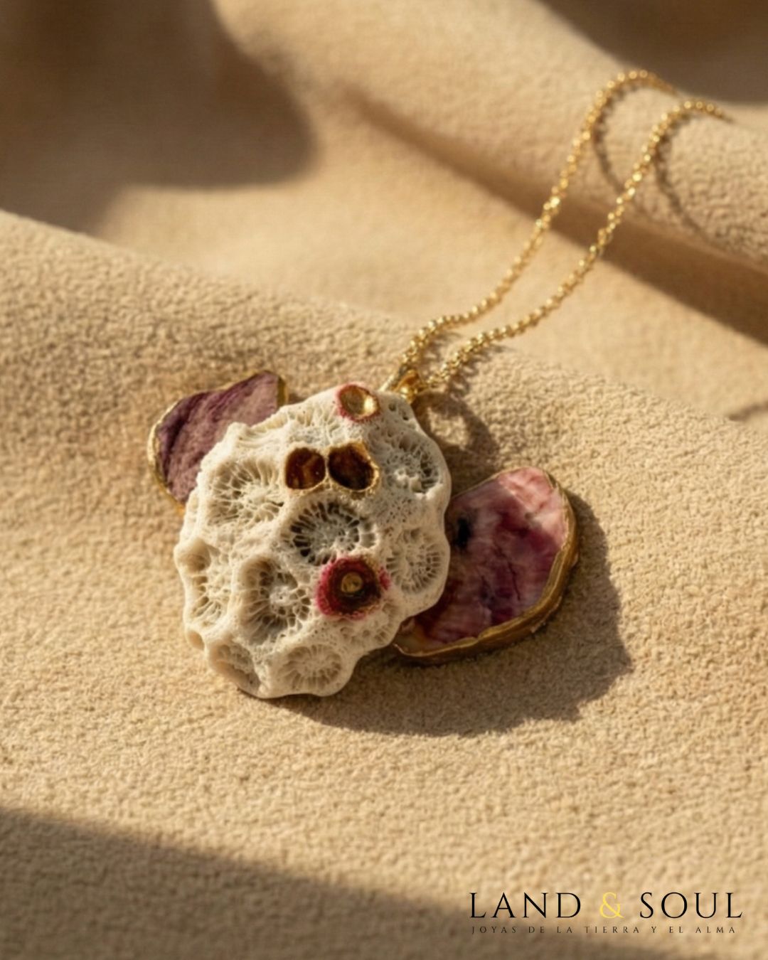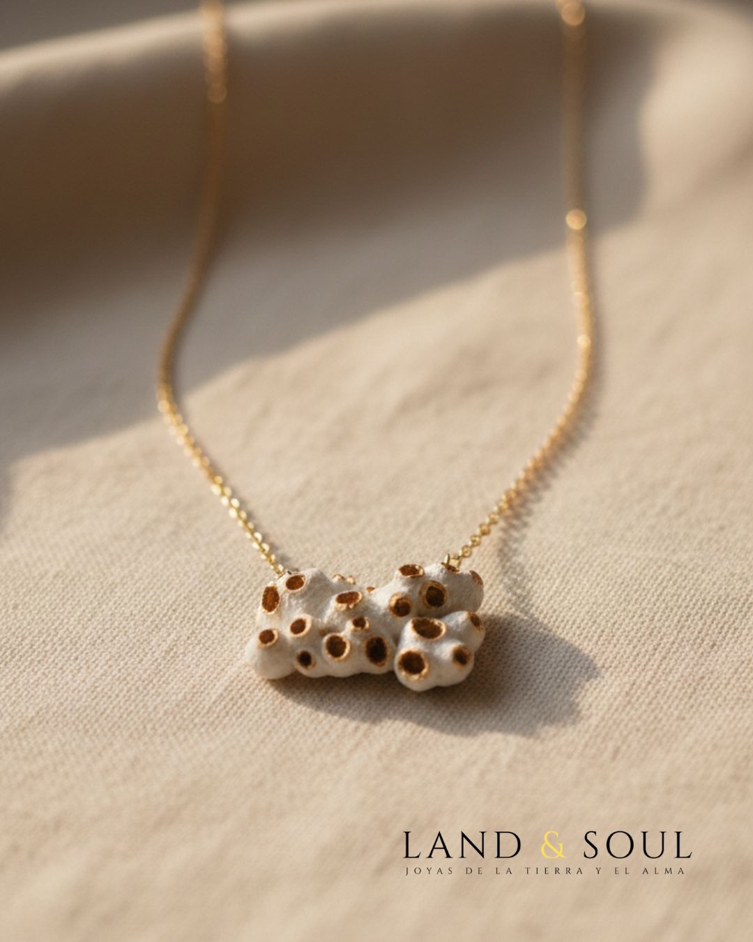 “Collar de 9 cm elaborado con barnacles unidos con resina, piezas de cerámica marina y cristales del mar, sobre cadena dorada – diseño exclusivo Land & Soul.”