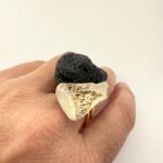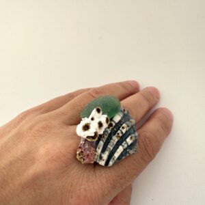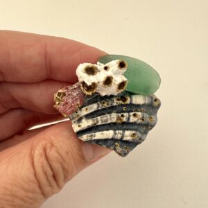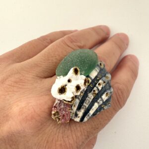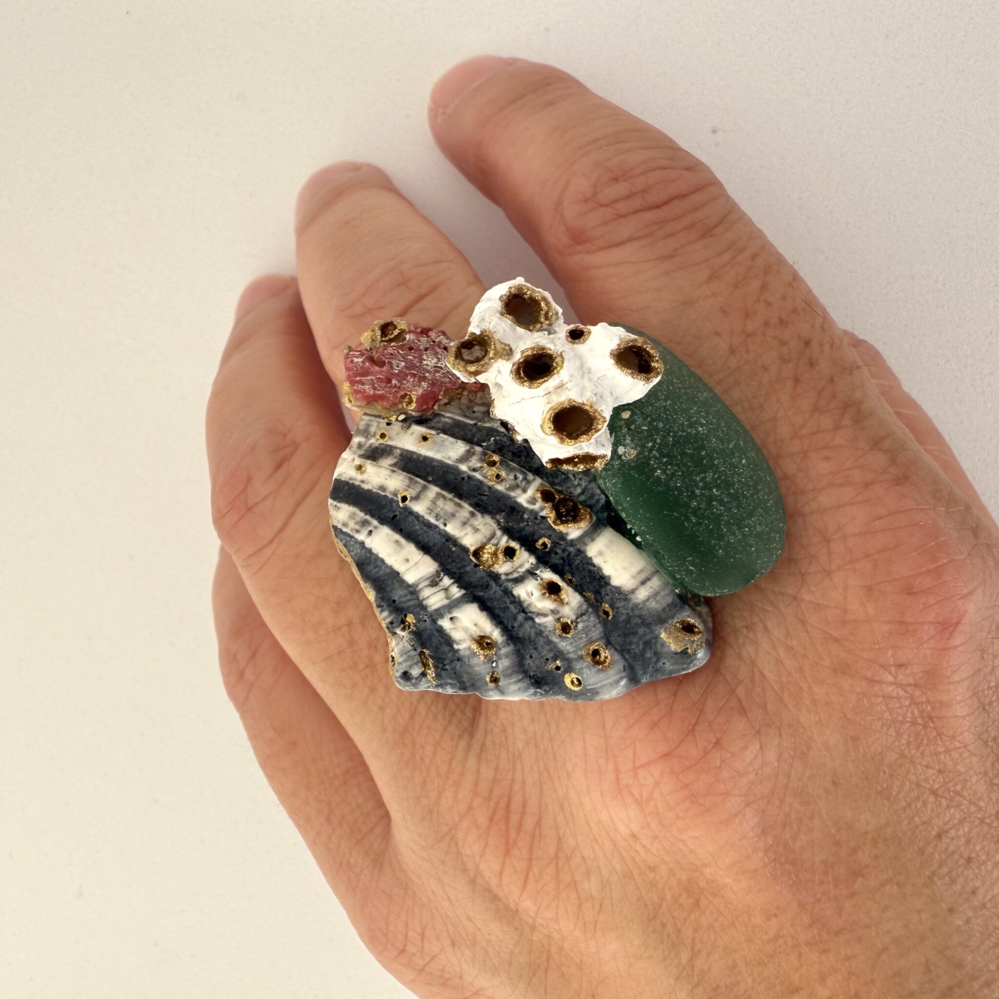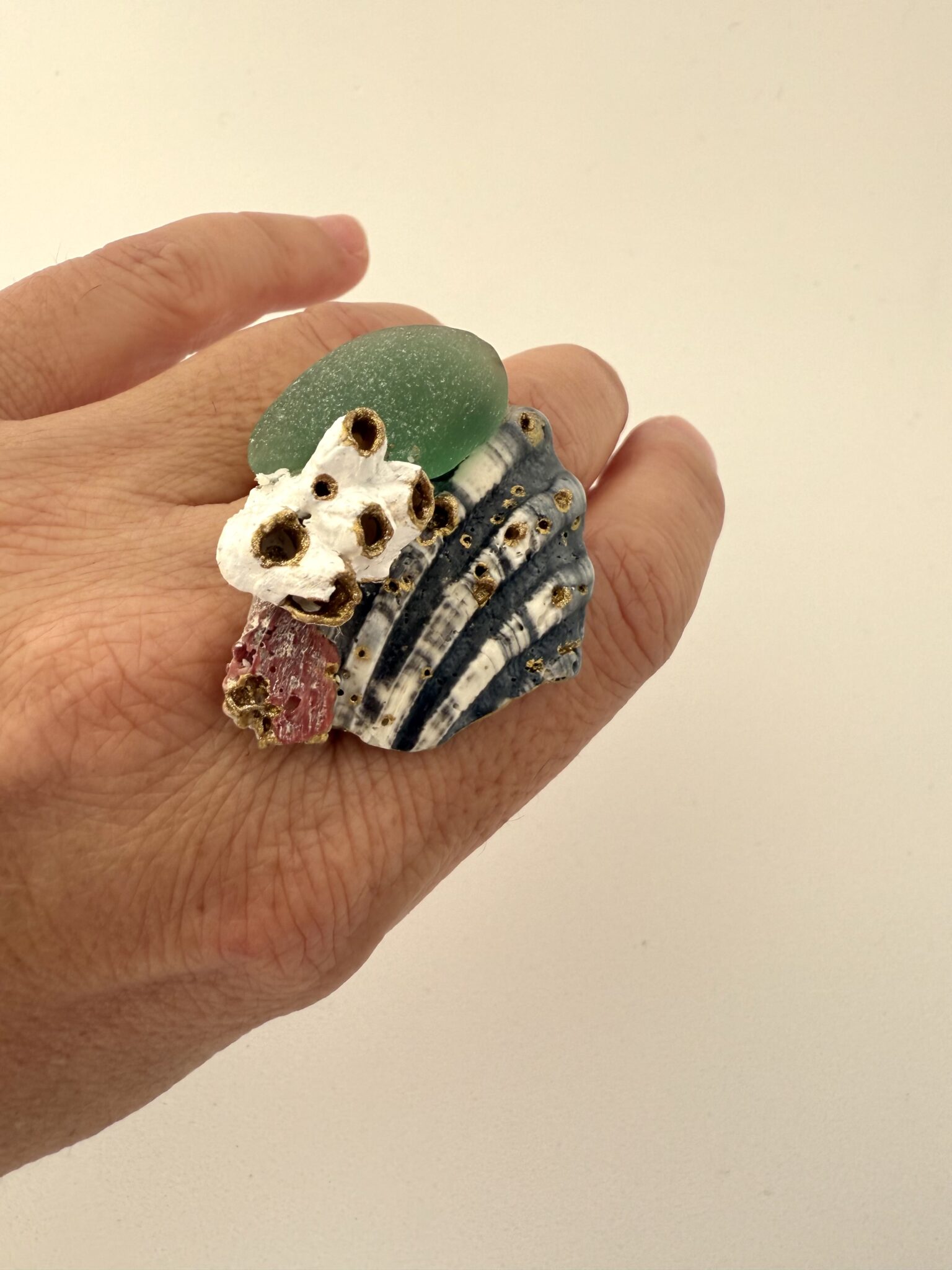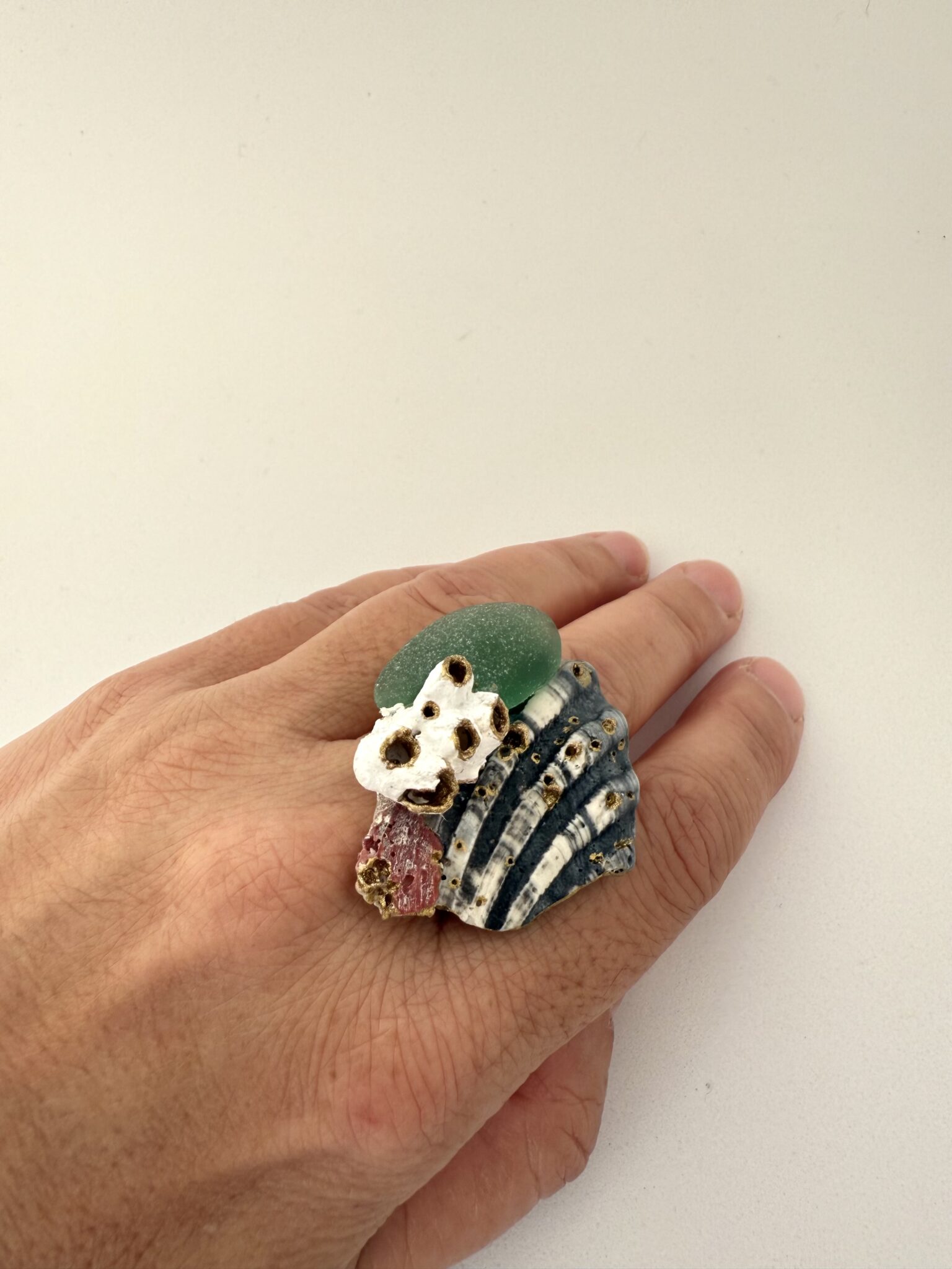 Este anillo está creado con la combinación de un fragmento de concha gris otro más pequeño color carmin, un cristal de mar color verde esmeralda y una pequeña familia de barnacles pintados en blanco con las bocas doradas.