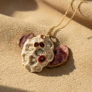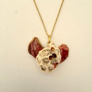 Esta pieza me recuerda a un corazón alado. Su parte central es un fragmento de coral fosilizado y dos pedacitos de concha color rojizo le acompañan en los laterales. Un diseño alegre y desenfadado.