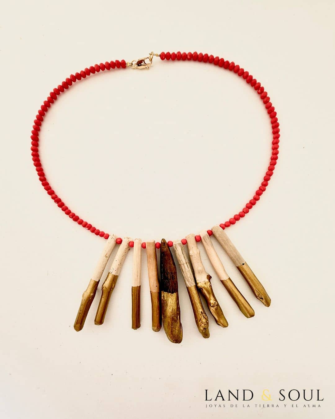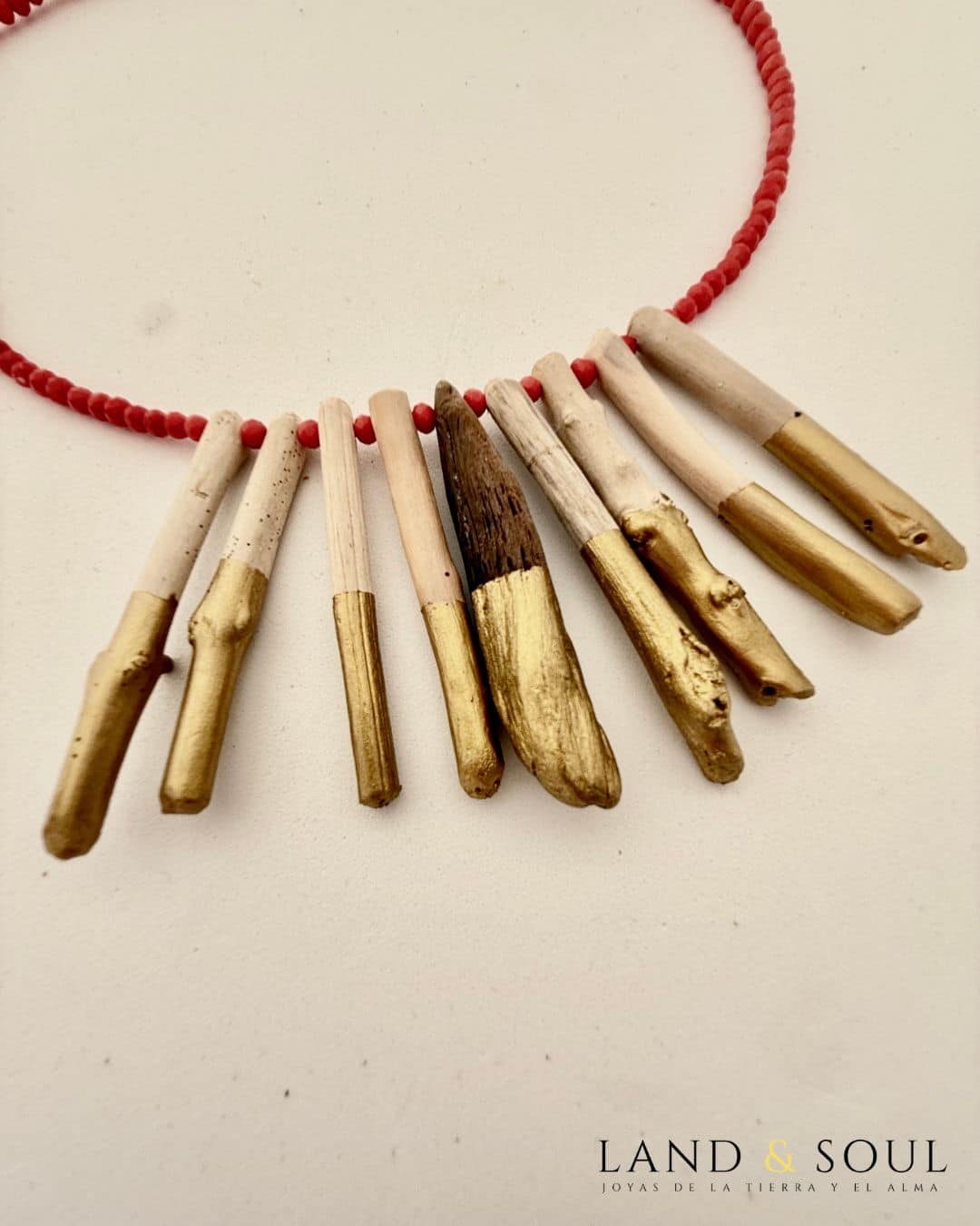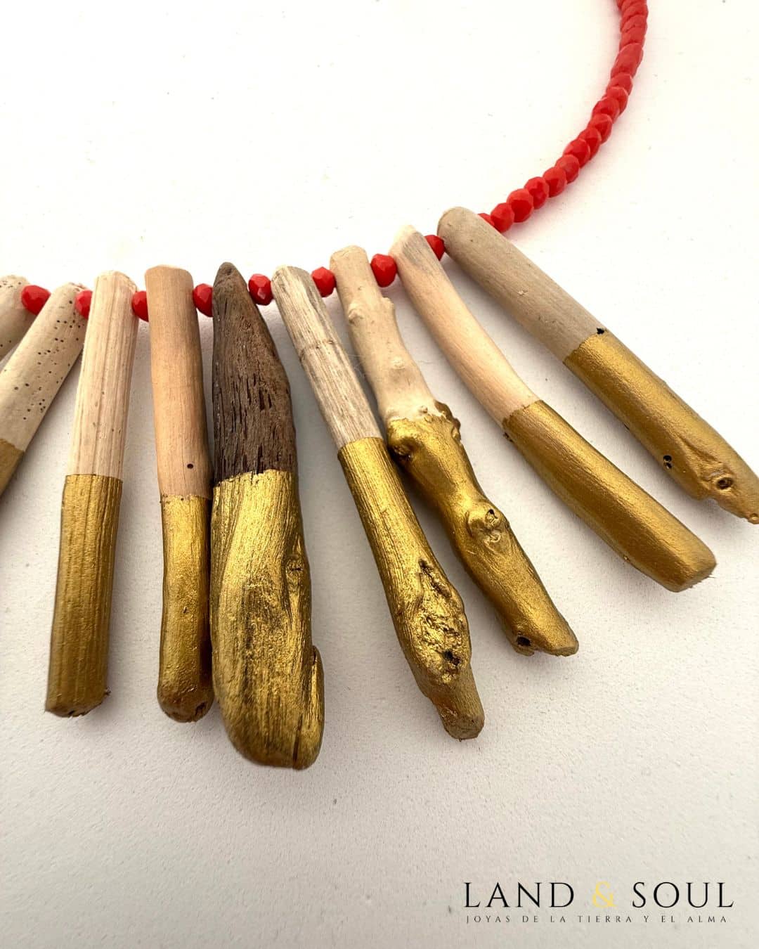 Collar creado a mano con fragmentos de maderas traídas por las mareas. Estas piezas de madera del mar toman un aspecto desgastado al estar bañadas con el agua salada y sus marcas se resaltan con el color dorado que cubre su mitad inferior.