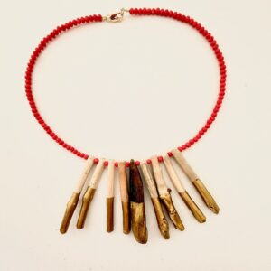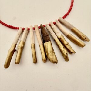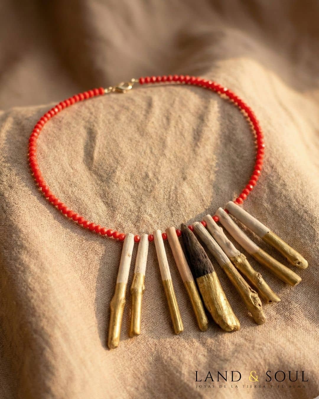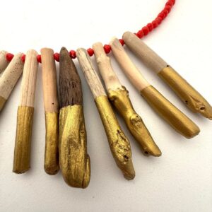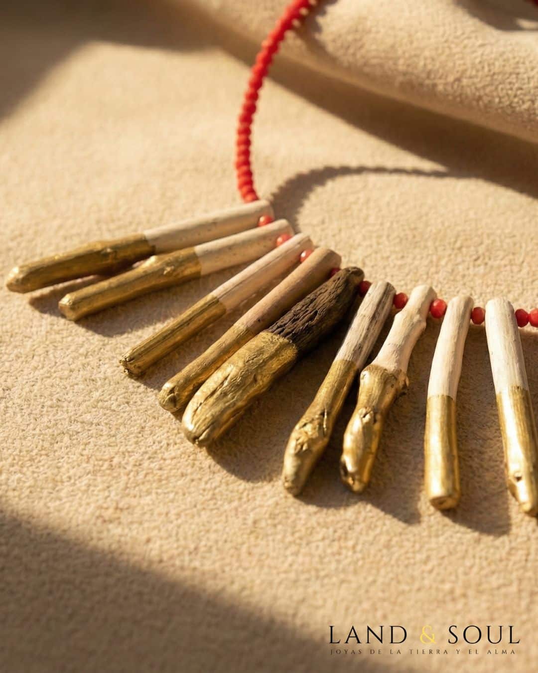 Collar creado a mano con fragmentos de maderas traídas por las mareas. Estas piezas de madera del mar toman un aspecto desgastado al estar bañadas con el agua salada y sus marcas se resaltan con el color dorado que cubre su mitad inferior.