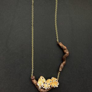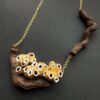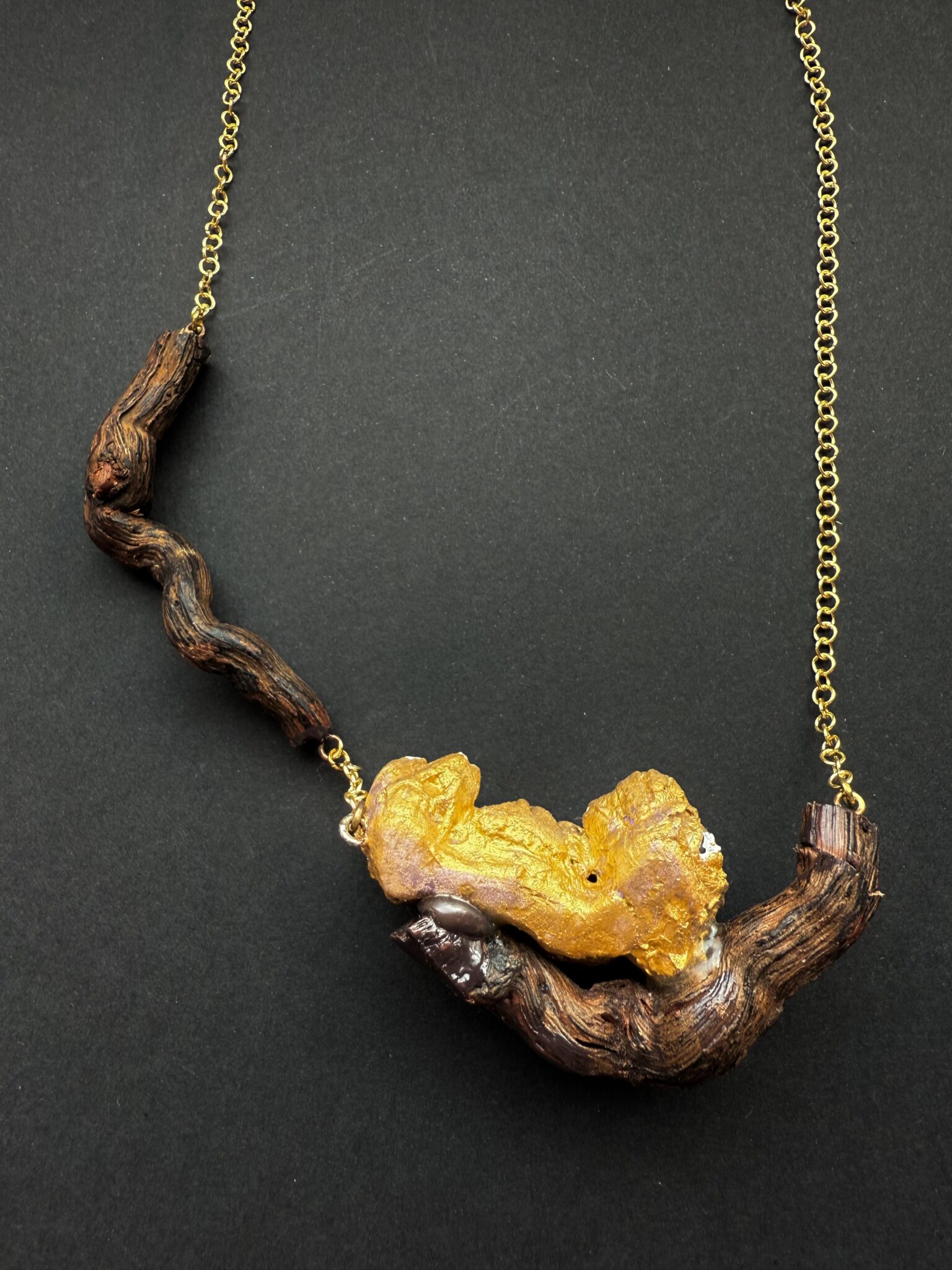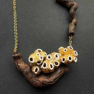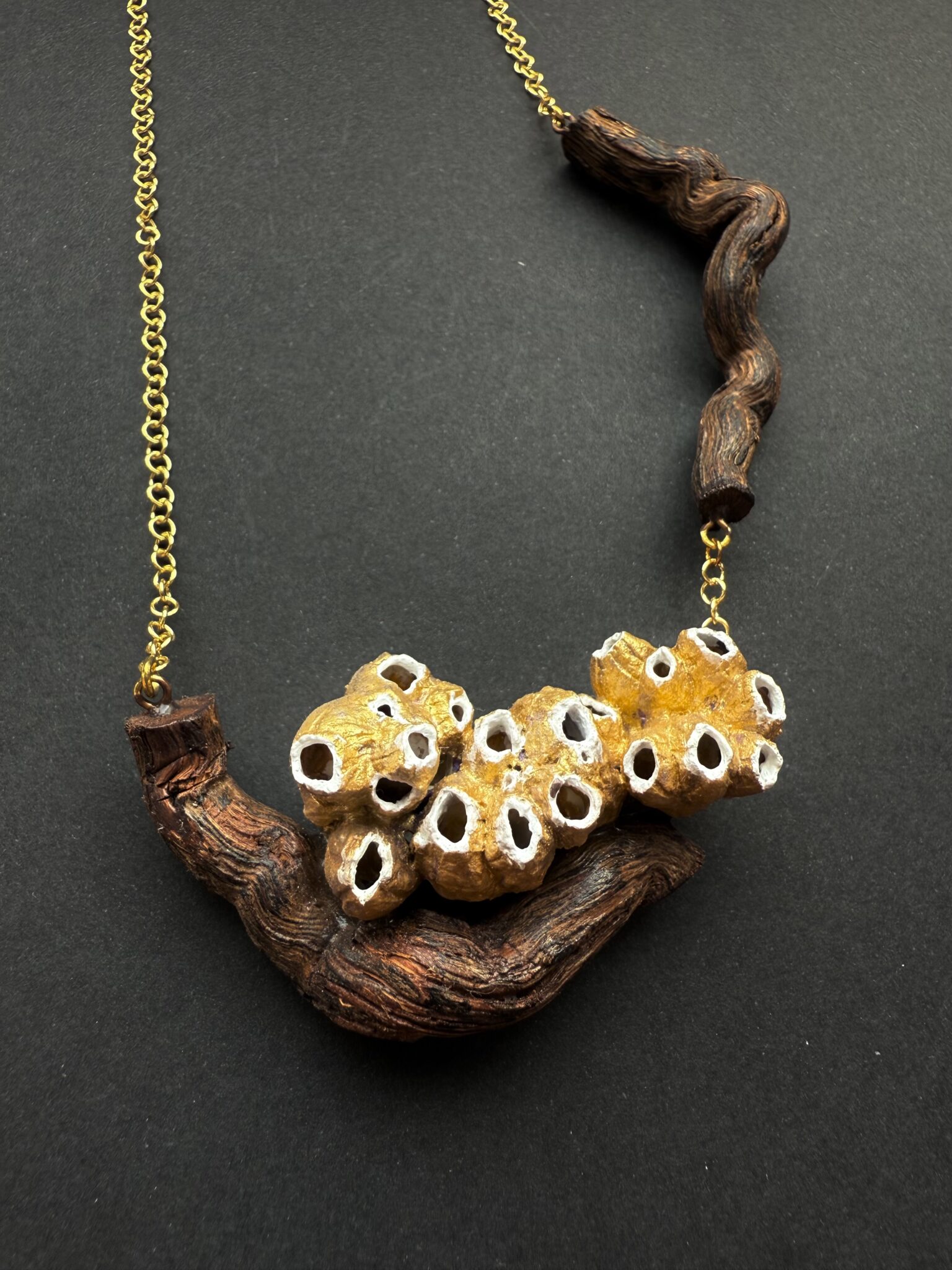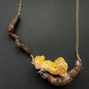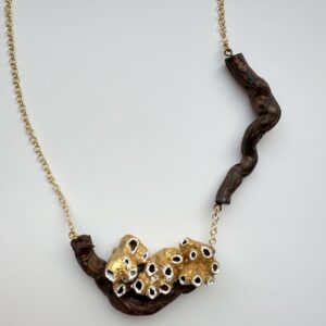 | Collar Soy Raíz | Collar que une las viñas y el mar. Creado con la raíz de una cepa como base y una familia de balanus pintados en oro viejo. |