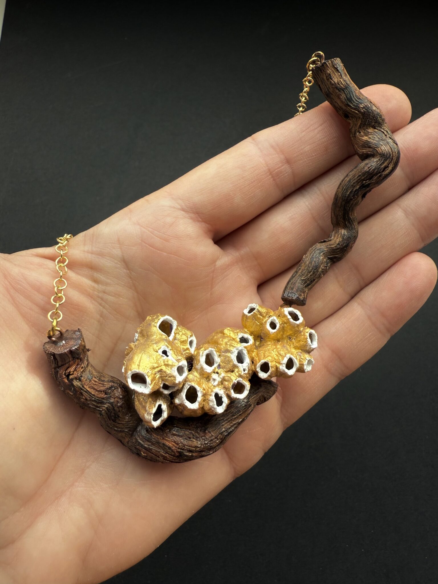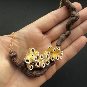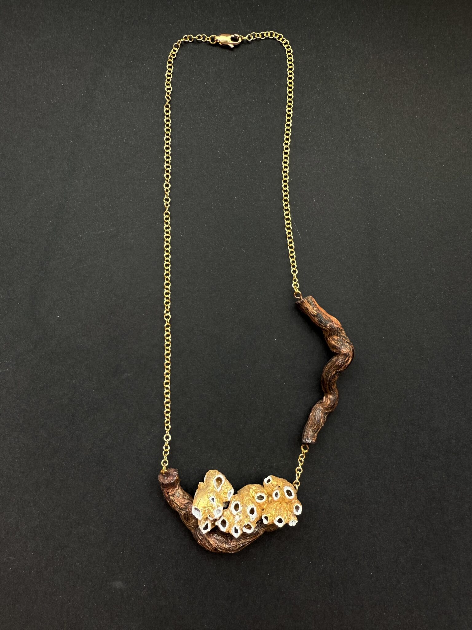 Este collar une las viñas y el mar, pues está creado con dos fragmentos de raíz de una parra como base y varias familias de barnacles (balanus) unidos y pintados en oro viejo con las bocas blancas. Los une una cadena de pequeños eslabones chapada en oro de 18k.
