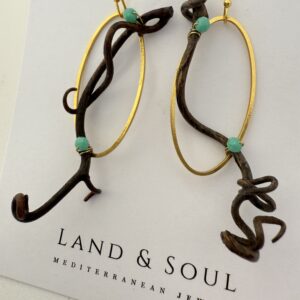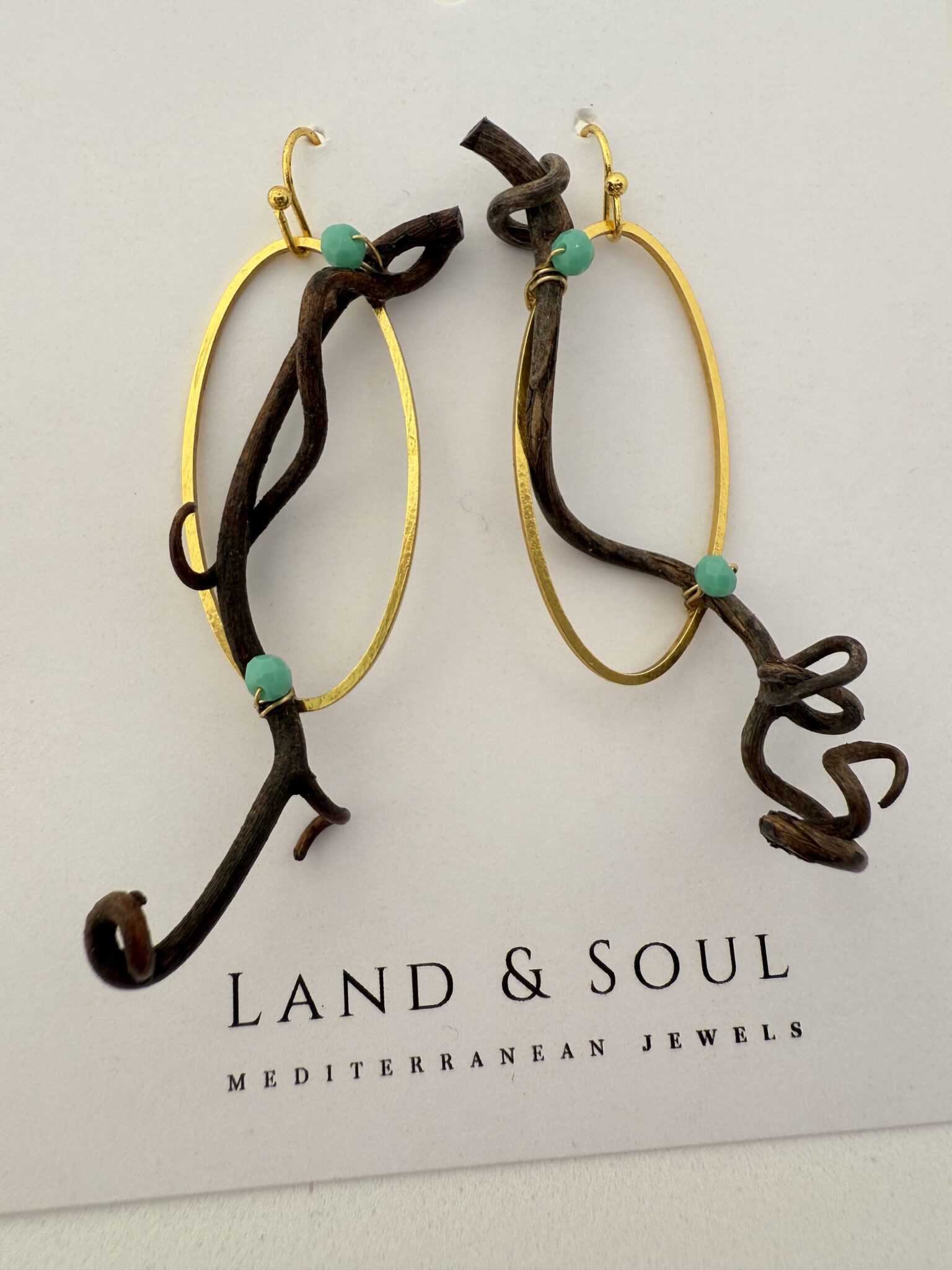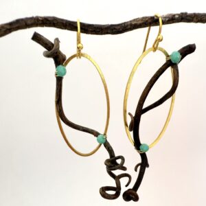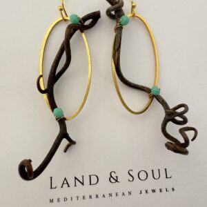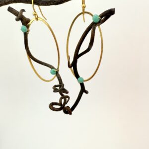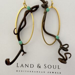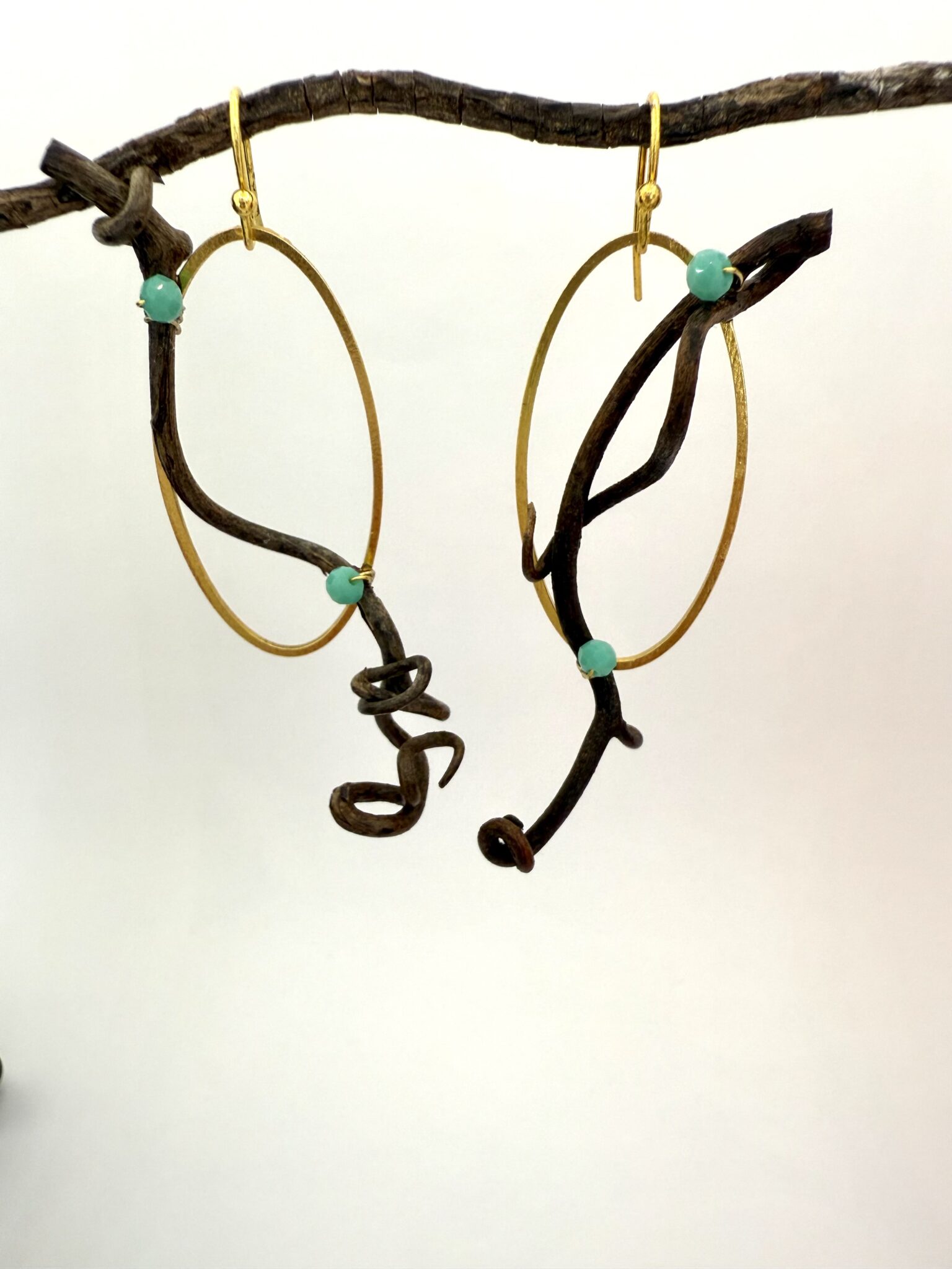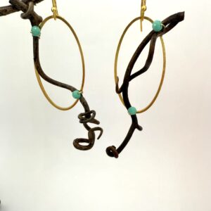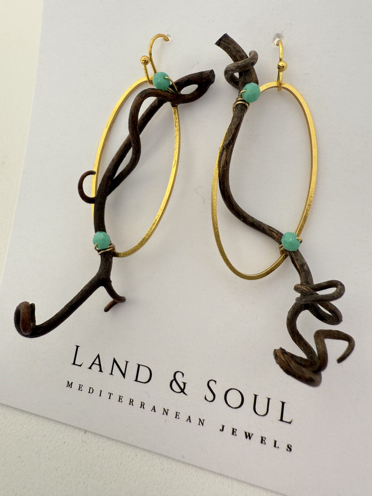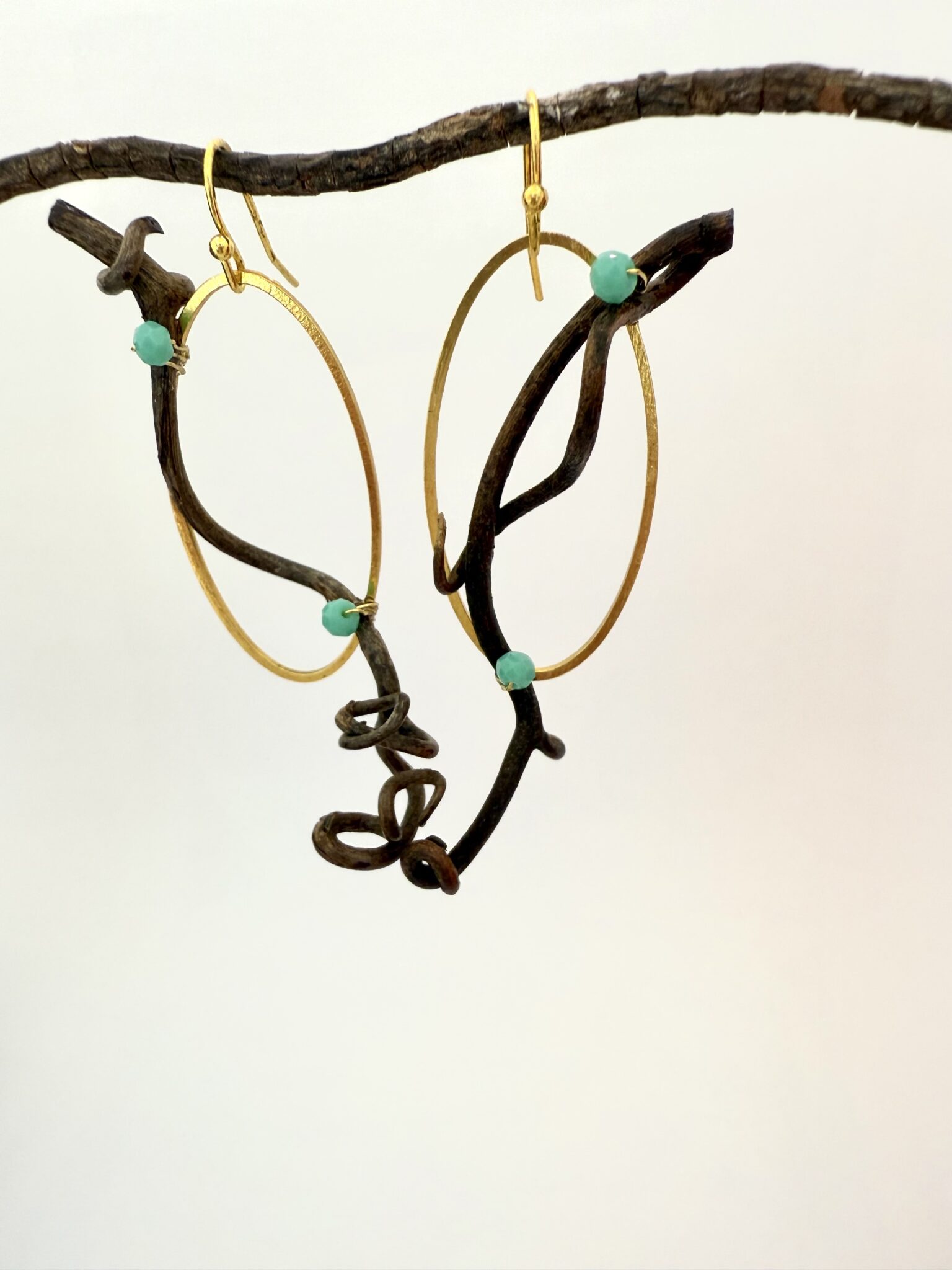Estos dos zarcillos largos engarzados en dos óvalos de latón dorado son una pareja decorada cristales facetados de verde turquesa.